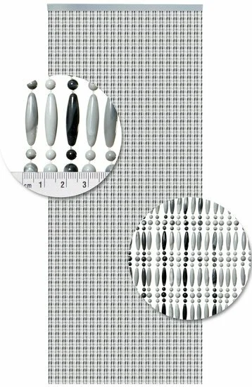 Luxe kralengordijn gemaakt van nylon draad. De kunststof kralen zijn stuk voor stuk aan het nylon draad gesmolten. Het geheel hangt aan een kunststof witte cassette.