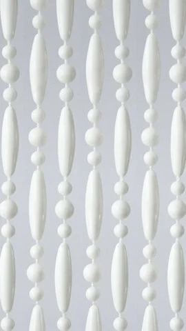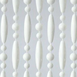 Luxe kralengordijn gemaakt van nylon draad. De kunststof kralen zijn stuk voor stuk aan het nylon draad gesmolten. Het geheel hangt aan een kunststof witte cassette.