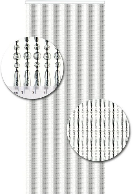 Dit zijn kwalitatief gezien echt goede kralengordijnen. De draadjes die gebruikt zijn, zijn gemaakt van nylon en dus extra sterk. De kunststof kralen zijn stuk voor stuk aan het nylon draad gesmolten. Het geheel hangt aan een witte cassette. Het is een vrij dicht kralengordijn waarbij er op circa elke centimeter een streng hangt. Om als voorbeeld even een vliegengordijn met een breedte van 90cm te noemen; hier hangen circa 90 strengen aan.