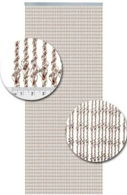 Dit zijn kwalitatief gezien echt goede kralengordijnen. De draadjes die gebruikt zijn, zijn gemaakt van nylon en dus extra sterk. De kunststof kralen zijn stuk voor stuk aan het nylon draad gesmolten. Het geheel hangt aan een witte cassette. Het is een vrij dicht kralengordijn waarbij er op circa elke centimeter een streng hangt. Om als voorbeeld even een vliegengordijn met een breedte van 90cm te noemen; hier hangen circa 90 strengen aan.